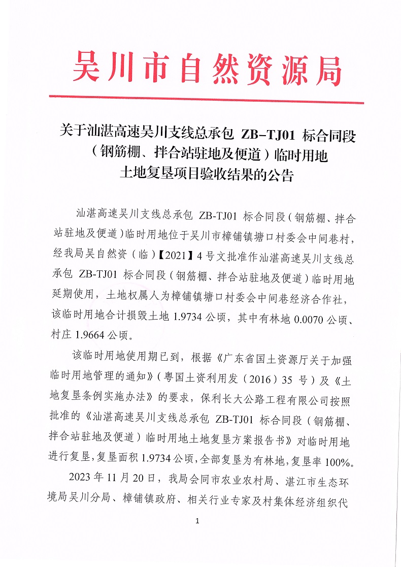 关于汕湛高速吴川支线总承包ZB-TJ01标合同段(钢筋棚、拌合站驻地及便道)临时用地土地复垦项目验收结果的公告