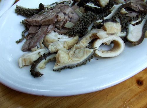 在我们吴川的饮食文化中,食物中的动物内脏占有不可或缺的地位。那些“猪杂水”店和“牛杂水”店就是专门吃猪内脏和牛内脏的专卖店。“猪杂水”和“牛杂水”的做法基本雷同,都是把牛内脏和猪内脏放到一锅水里煮,水里加上适当的调味香料,煮上几个小时后捞出来切碎,然后蘸着姜茸或其它调料吃。那一锅炖肉水加上些葱花,就是美味的鲜汤了,味道非常鲜美。总之,“牛杂水”和“猪杂水”的吃法很简单朴素,有点返璞归真的意味。外地人可能会认为吃牛和猪的内脏会感觉到很脏,因而拒绝吃这种廉价的快餐。其实,“牛杂水”和“猪杂水”不仅仅是牛和猪的内脏,里边也有很多牛肉和猪肉,而且内脏都被弄得很干净,一点异味也没有。由于价廉物美,十块钱就有一大碟牛肉,是体力劳动阶层首选的午餐。