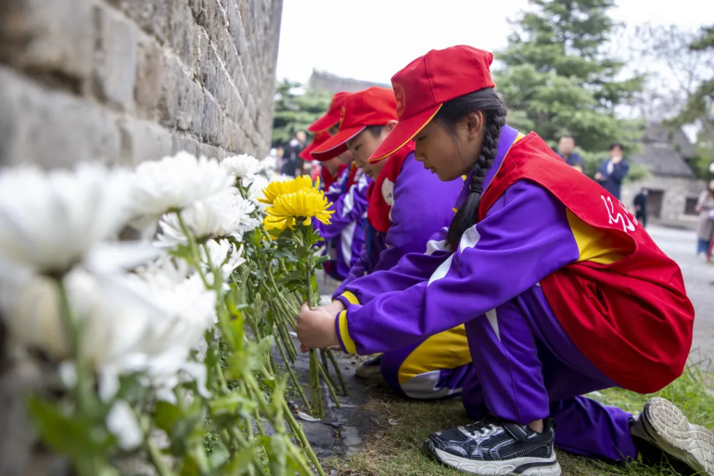 在山东枣庄台儿庄古城,当地学生参加鲜花祭奠活动。(受访单位供图)