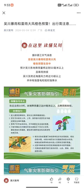 强化部门联动,及时发布预警。市三防办组织气象、水文等部门每天会商研判,紧盯雨情发展变化,加强强降雨、强对流等恶劣天气监测预报预警,提高预报精度,为防御工作提供科学依据和精准支撑。同时,通过电视广播、吴川融媒、吴川发布、手机短信等主流媒体密集发布预警信息和防范避险提示,指引群众防灾避险。节日期间,发布预警信号共计16次,地质灾害风险提醒短信2条,共向全市各级党政领导、各级三防责任人、群众等发送气象灾害信息63条,接收人次达189万人次。
