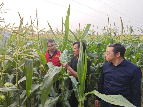 在东来喜农业有限公司,博士们查看玉米种植情况,并建议试种一些新品种。