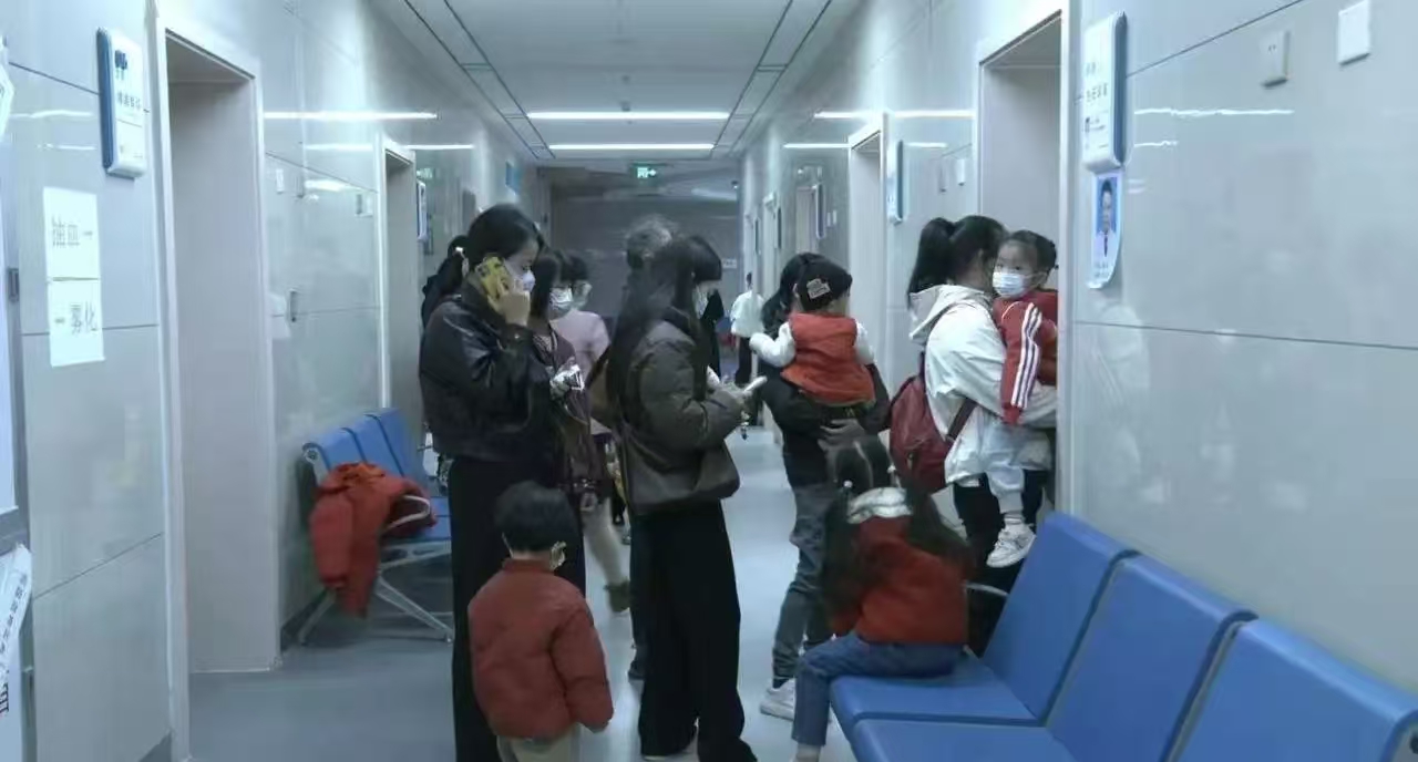 11月28日,记者在医院看到,门诊大厅内候诊患儿及家长人数众多,儿科诊室医护人员忙碌有序。