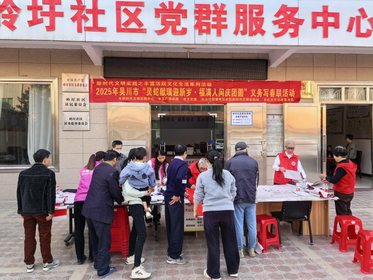春节,作为中华民族最隆重的传统节日之一,承载着团圆、希望与新生的深刻内涵。在2025年新春佳节即将来临之际,为弘扬中华优秀传统文化,营造浓厚的节日氛围,1月9日上午,吴川市新时代文明实践中心、市文广旅体局、市文化馆携手大山江街道岭圩社区新时代文明实践站,共同举办了“灵蛇献瑞迎新岁·福满人间庆团圆”义务写春联活动。
