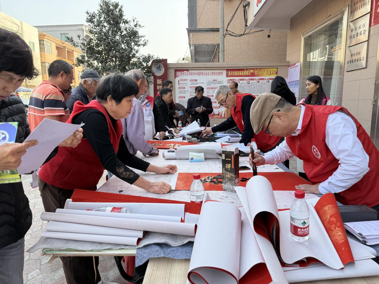 随后,活动迎来了高潮部分——为社区群众义务写春联。来自吴川市书法家协会的书法家们挥毫泼墨,为社区居民免费书写春联。一幅幅寓意吉祥、笔力遒劲的春联跃然纸上,不仅为即将到来的春节增添了喜庆气氛,更让居民们感受到了浓浓的年味和传统文化的魅力。居民们手捧春联,脸上洋溢着幸福的笑容。