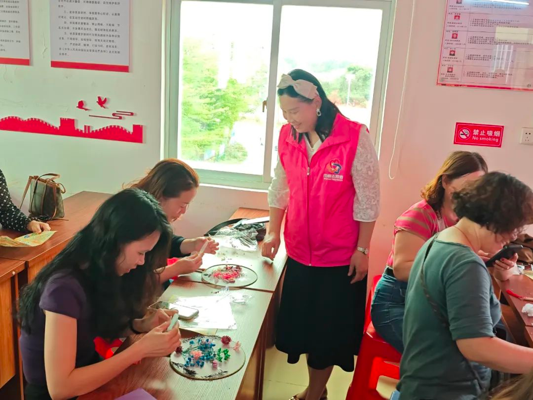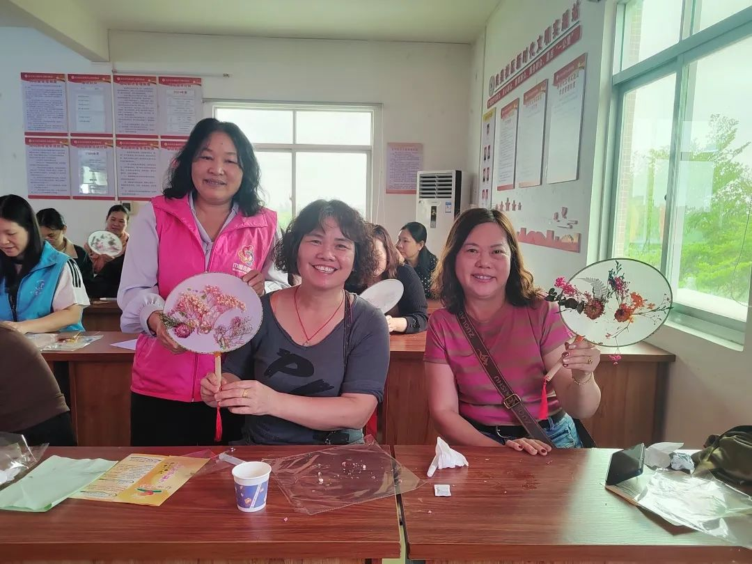 社工借助巧妙的口号引入手工环节-团扇,为大家分发团扇材料包,随后向大家讲解团扇的操作步骤:将永生花材料涂上酒精胶-依次将材料花束粘贴在扇面上-漂亮的团扇就完成啦。