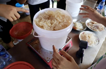 夜幕降临,队员们带着直播设备直奔大山江良美村的海蜇加工厂。作为良美村的支柱产业之一,这座加工厂承载着渔民近二十几年的生计,也是海蜇从鲜货到成品的关键环节。镜头下,队员们带领观众参观分拣区、清洗池、腌制车间,向负责人请教“良美村海蜇加工厂坚持了30年的传统工艺”,详解“海水过滤清洗”“低盐腌制”等特色流程如何保留海蜇的鲜味。