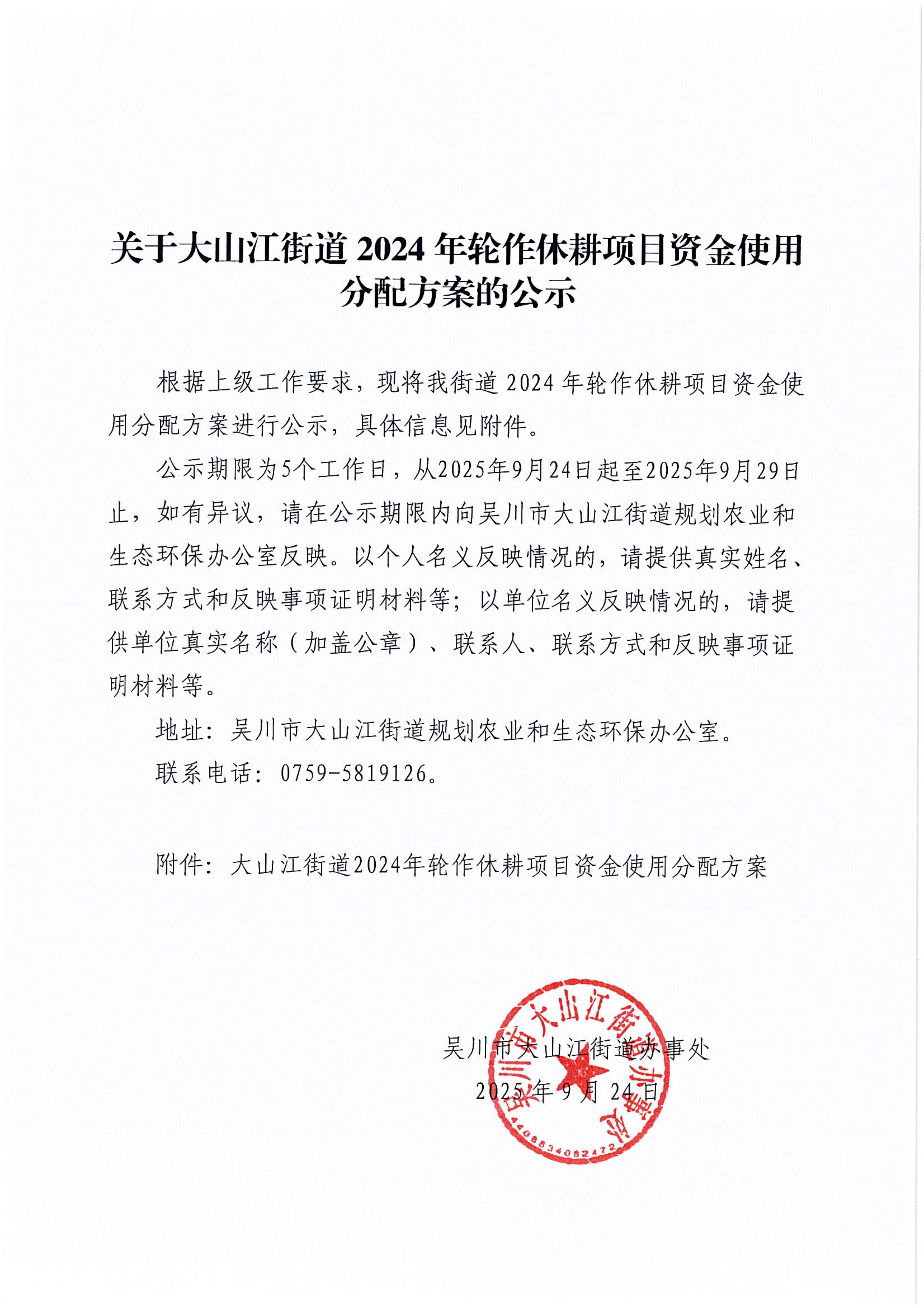 关于大山江街道2024年轮作休耕项目资金使用分配方案的公示