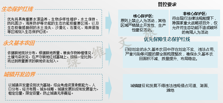《方案》提出,要以主体功能区规划为基础,全面摸清并分析国土空间本底条件,划定城镇、农业、生态空间以及生态保护红线、永久基本农田、城镇开发边界(简称“三区三线”),注重开发强度管控和主要控制线落地,统筹各类空间性规划,编制统一的省级空间规划,为实现“多规合一”、建立健全国土空间开发保护制度积累经验、提供示范。