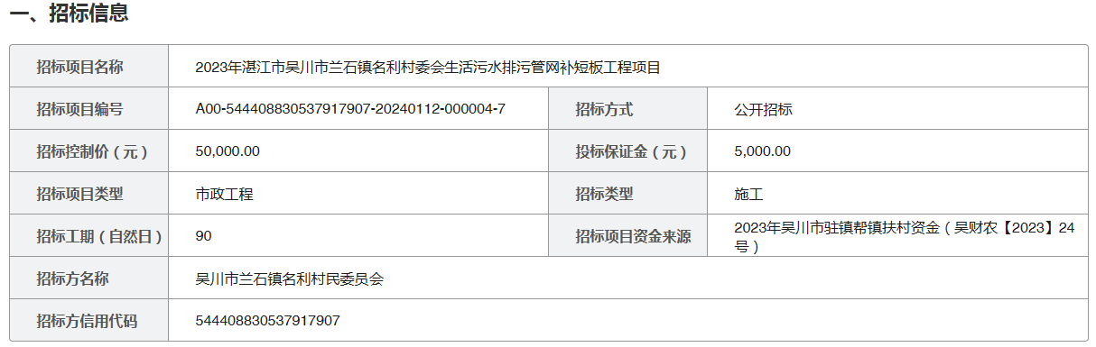 2023年湛江市吴川市兰石镇名利村委会生活污水排污管网补短板工程项目招标公告
