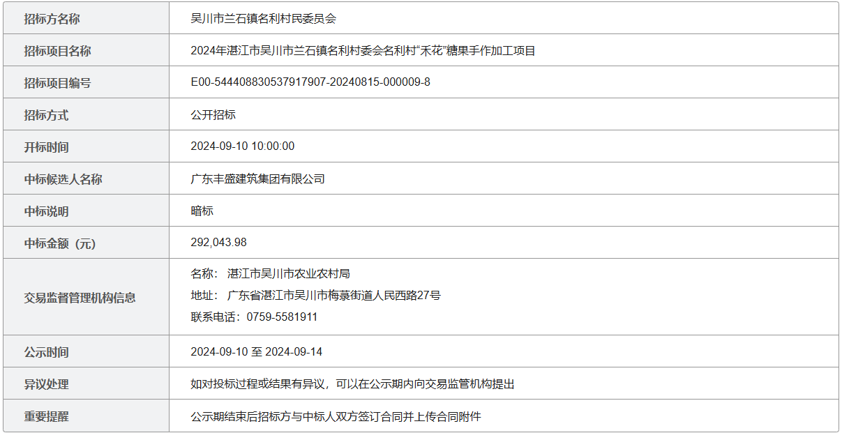 2024年湛江市吴川市兰石镇名利村委会名利村“禾花”糖果手作加工项目中标候选人公示