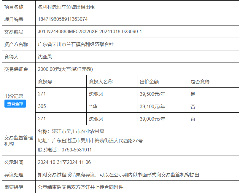 经委托,名利村赤恒车鱼塘出租出租项目于2024-10-31采取公开竞价方式进行交易,现将本次交易结果公示如下:
