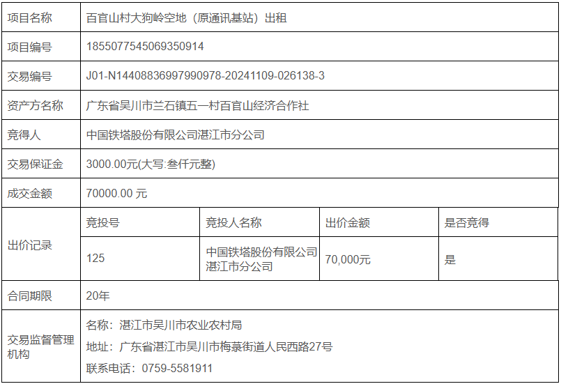 经委托,百官山村大狗岭空地(原通讯基站)出租项目于2024-11-20采取公开竞价方式进行交易,现将本次交易成交公告如下: