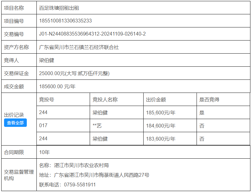 经委托,百足珠塘招租出租项目于2024-11-21采取公开竞价方式进行交易,现将本次交易成交公告如下: