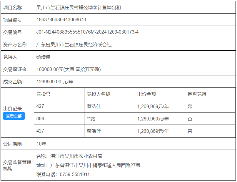 经委托,吴川市兰石镇庄艮村鲤公塘茅针鱼塘出租项目于2024-12-12采取公开竞价方式进行交易,现将本次交易成交公告如下: