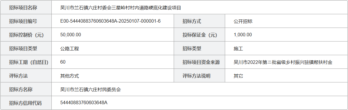 吴川市兰石镇六庄村委会三星岭村村内道路硬底化建设项目招标公告
