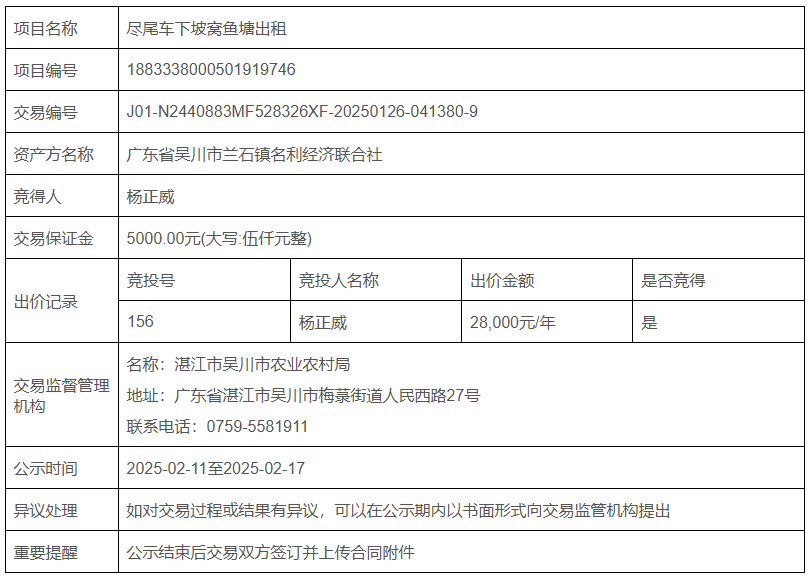 经委托,尽尾车下坡窝鱼塘出租项目于2025-02-11采取公开竞价方式进行交易,现将本次交易结果公示如下: