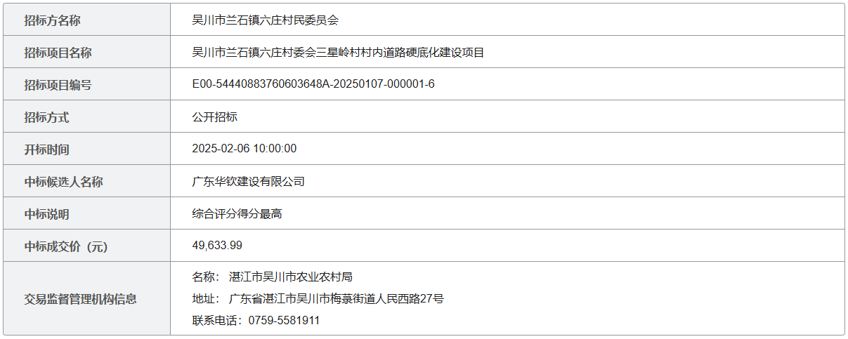 吴川市兰石镇六庄村委会三星岭村村内道路硬底化建设项目中标公告