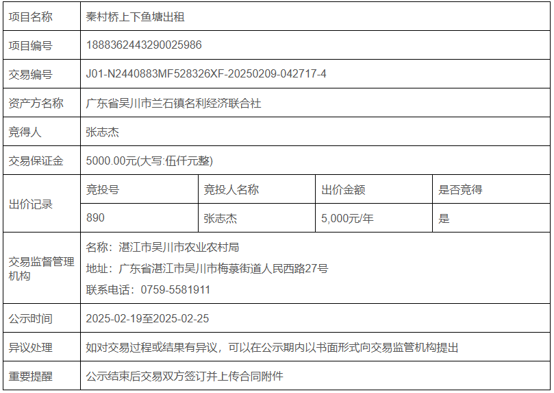 经委托,秦村桥上下鱼塘出租项目于2025-02-19采取公开竞价方式进行交易,现将本次交易结果公示如下: