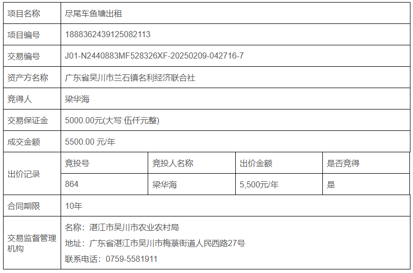 经委托,尽尾车鱼塘出租项目于2025-02-19采取公开竞价方式进行交易,现将本次交易成交公告如下: