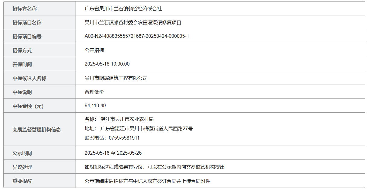 吴川市兰石镇顿谷村委会农田灌溉渠修复项目中标候选人公示
