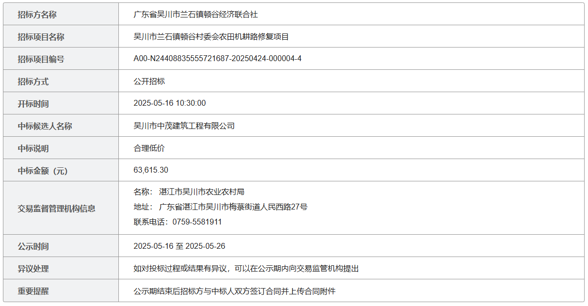 吴川市兰石镇顿谷村委会农田机耕路修复项目中标候选人公示
