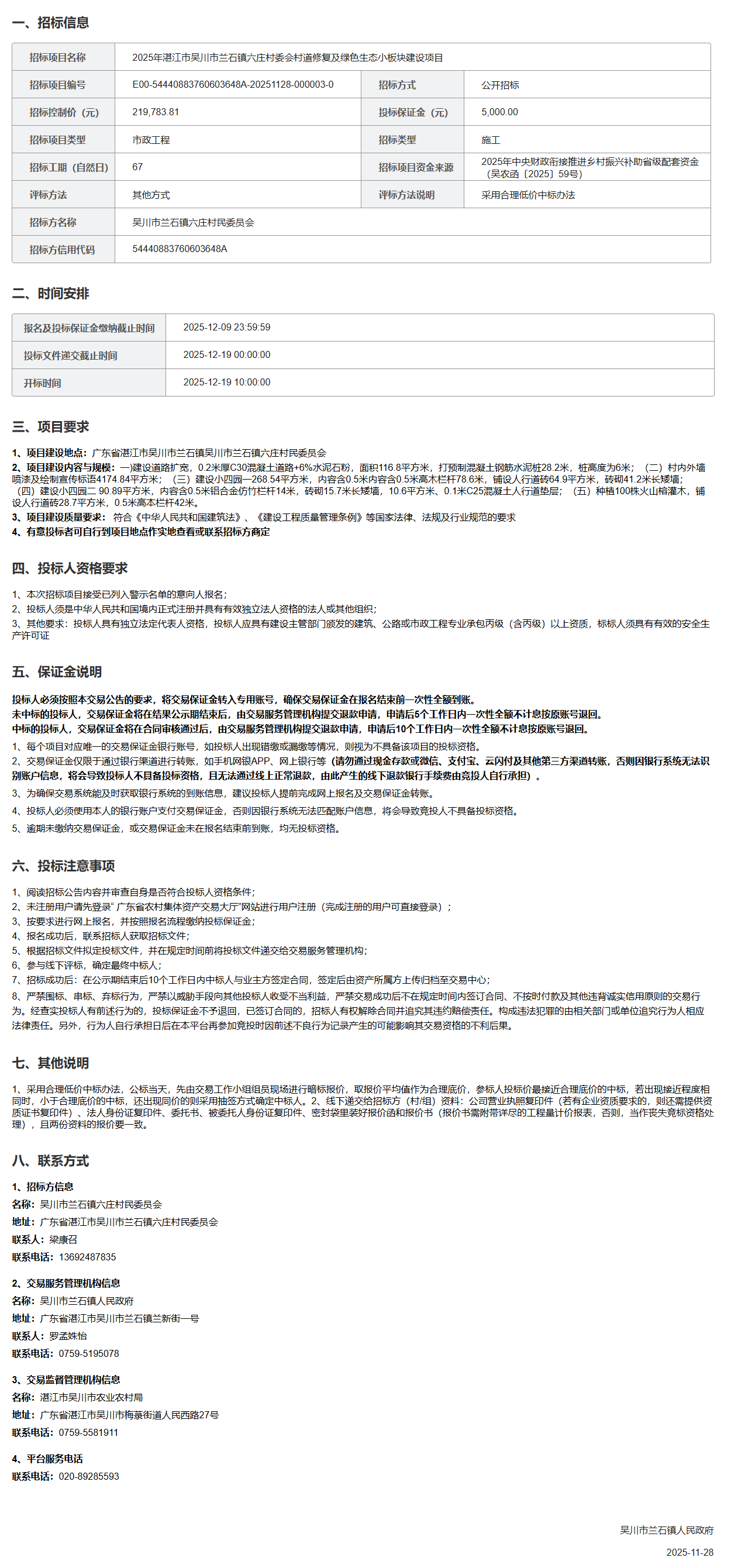 2025年湛江市吴川市兰石镇六庄村委会村道修复及绿色生态小板块建设项目