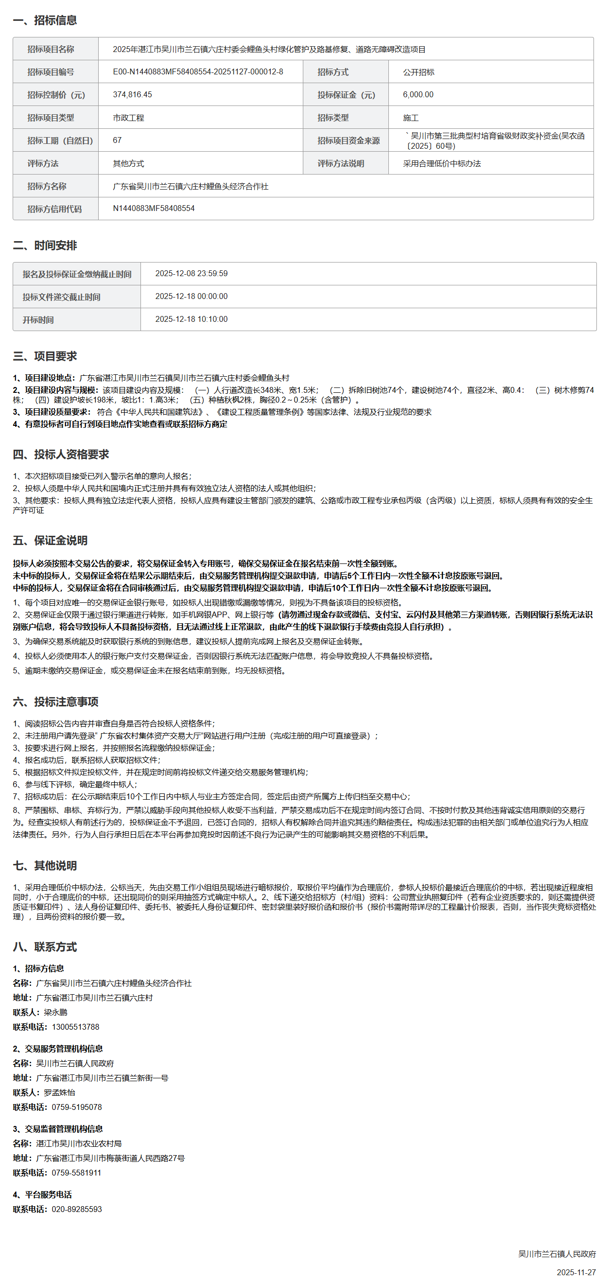 2025年湛江市吴川市兰石镇六庄村委会鲤鱼头村绿化管护及路基修复、道路无障碍