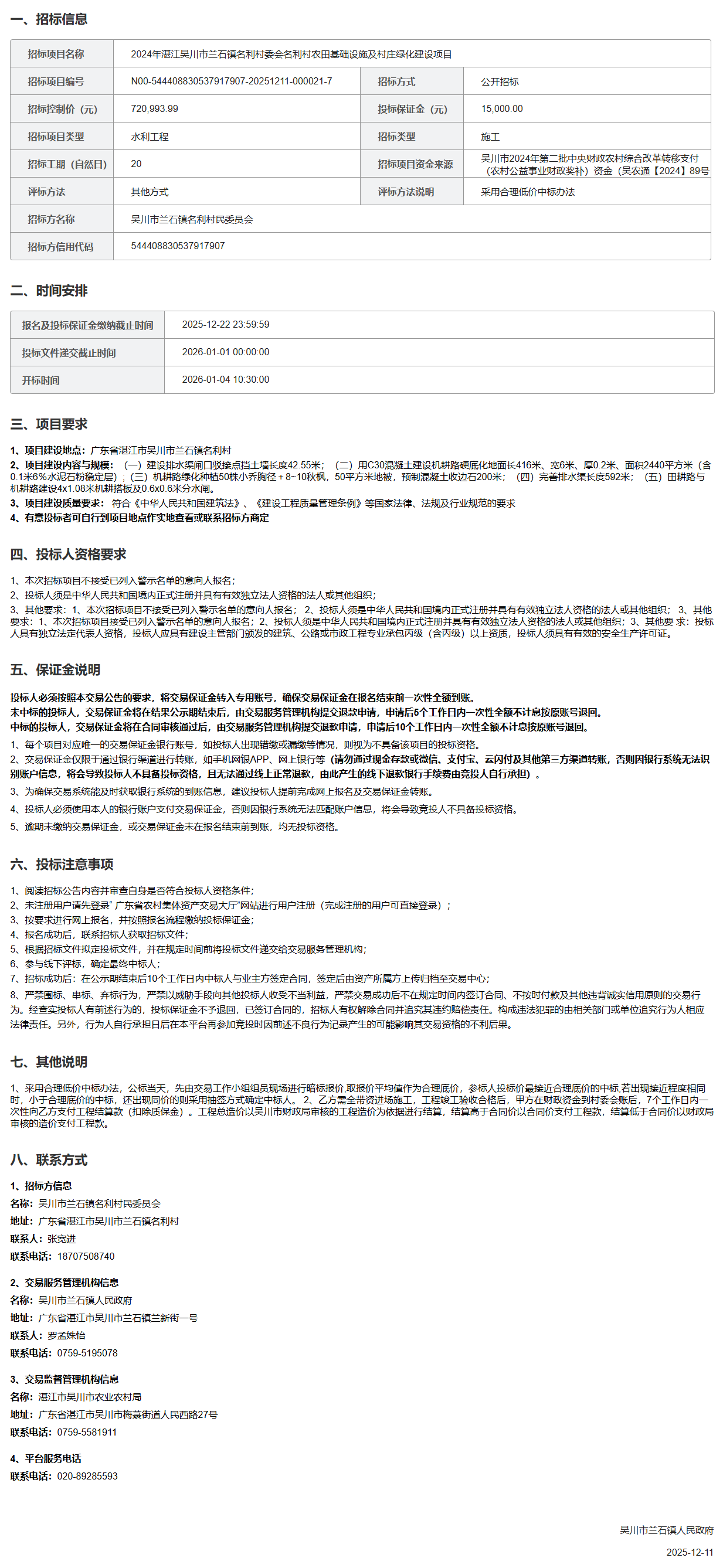 2024年湛江吴川市兰石镇名利村委会名利村农田基础设施及村庄绿化建设项目