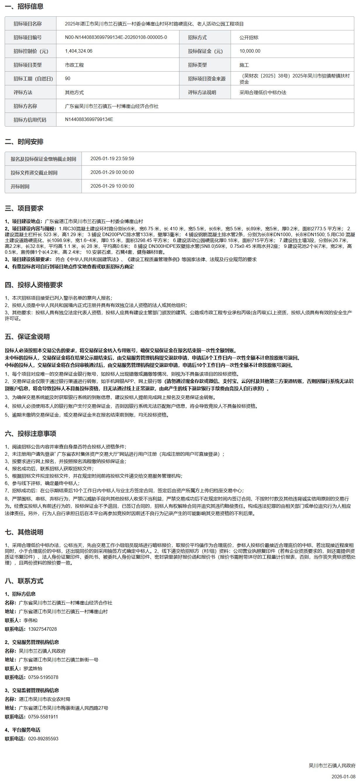 2025年湛江市吴川市兰石镇五一村委会博崖山村环村路硬底化、老人活动公园工程
