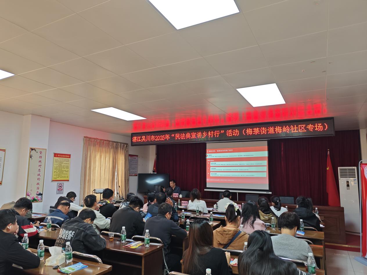 为深入推进法治宣传教育走深走实,切实提升基层群众法治意识和风险防范能力,2025年12月5日,吴川市委政法委、市法学会、梅菉街道在梅岭社区联合开展湛江市吴川市2025年“民法典宣讲乡村行”暨《反有组织犯罪法》宣传活动,为社区居民送上“家门口的法治服务”。吴川市委政法委副书记、湛江市法学会理事黄兴娣出席活动,吴川市法学会工作人员、梅菉街道平安法治办负责同志及各社区干部代表、居民代表约100人参加。