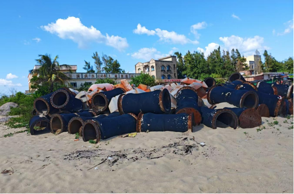 王村港镇婚纱摄影基地东侧海岸沙滩上堆放圆柱状的固体废弃物图片