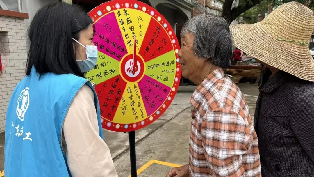 热闹的游戏之余,政策宣传区同样人头攒动。社工化身“政策讲解员”,通过转盘方式和一对一答疑,向长者们普及城乡居民养老保险、高龄津贴申领、特殊人群关爱等惠民政策。“阿婆,您今年80岁,符合高龄津贴条件,带上身份证去社区就能办!”社工拿着表格,逐字逐句为视力不佳的林奶奶讲解,确保她听懂每一项福利政策。