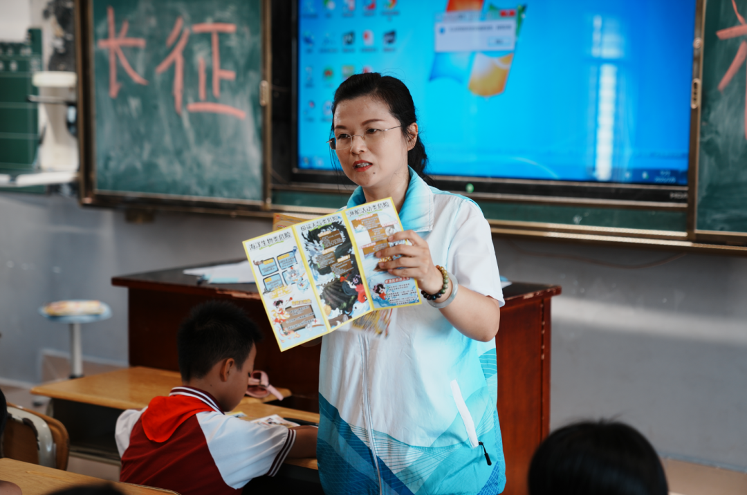 团队根据乡村儿童发展的现实需求,创造性构建“艺术+”的安全教育新模式。艺术设计学院学生党员带头组建创作专班,根据当地的文化元素,精心设计2套共12副颇具地方特色的原创手绘“防溺水”和“校园欺凌”系列宣传手册、自主研发交互式H5安全教育闯关游戏,让安全教育以孩子们喜闻乐见的方式深入人心。