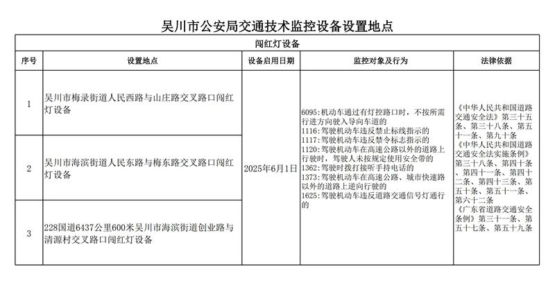 为预防和减少道路交通事故,确保道路交通安全通畅,吴川市公安局交警部门根据《中华人民共和国道路交通安全法》《中华人民共和国行政处罚法》等有关法律规定,经报省厅交管局审批同意,新增3套交通技术监控设备,定于2025年6月1日零时起开始执法。现向社会公布新增电子技术监控设备设置地点(详见附件),请广大交通参与者自觉遵守道路交通安全法律法规。