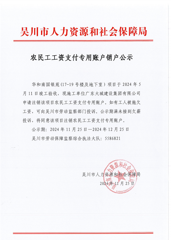 农民工工资支付专用账户销户公示