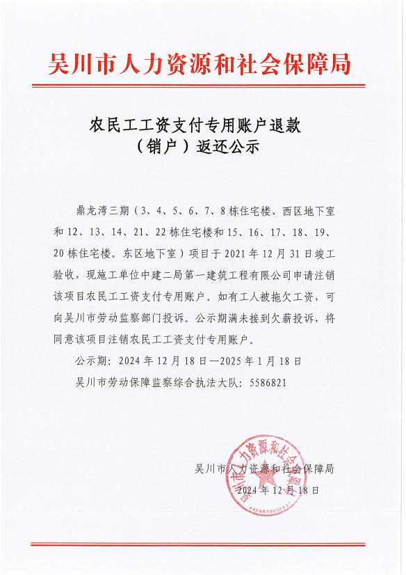 农民工工资支付专用账户退款(销户)返还公示