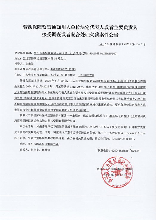 劳动保障监察通知用人单位法定代表人或者主要负责人接受调查或者配合处理欠薪案件公告