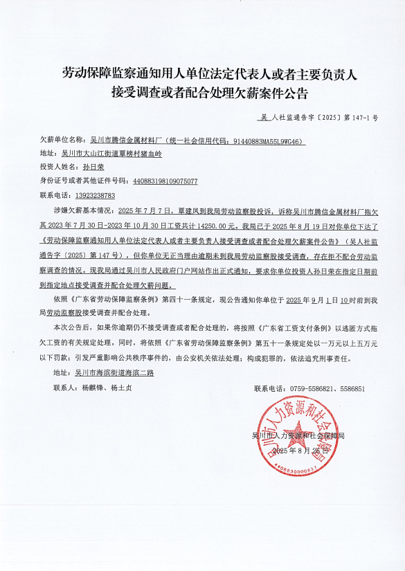劳动保障监察通知用人单位法定代表人或者主要负责人接受调查或者配合处理欠薪案件公告