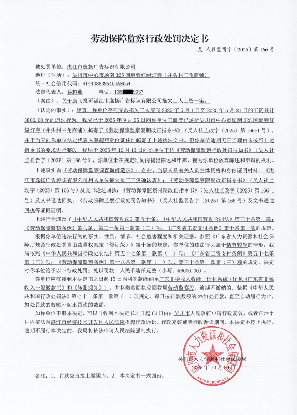劳动保障监察行政处罚决定书