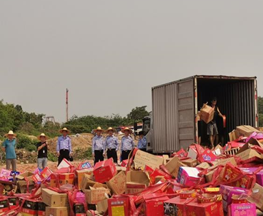 本次销毁行动共出动执法车5辆,烟花爆竹专运车5辆,消防救援车辆2辆,执法人员33人,烟花爆竹装卸工10人,集中销毁烟花爆竹共计1768箱(件),充分表明了我市打击烟花爆竹有关违法行为的鲜明态度与有力举措。