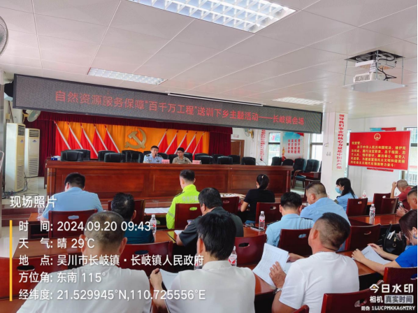 为宣导国家、省、湛江市关于自然资源保护和利用的政策精神,解决基层对自然资源相关政策理解不透、工作措施运用不当、执行不到位等问题,结合推进服务保障“百千万工程”送训下乡主题活动,2024年9月20日上午,吴川市自然资源局在吴川市长岐镇政府召开自然资源服务保障“百千万工程”送训下乡主题活动,参加会议人员有长岐镇综合执法队林全辉队长及执法队全体人员以及社区书记干部等。