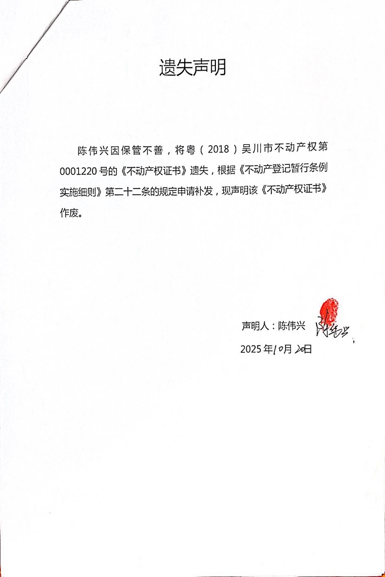 遗失声明(陈伟兴——粤(2018)吴川市不动产权第0001220号)