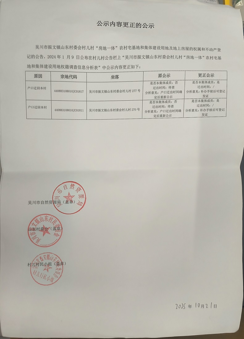 吴川市振文镇山东村委会村儿村“房地一体”公示内容更正的公示