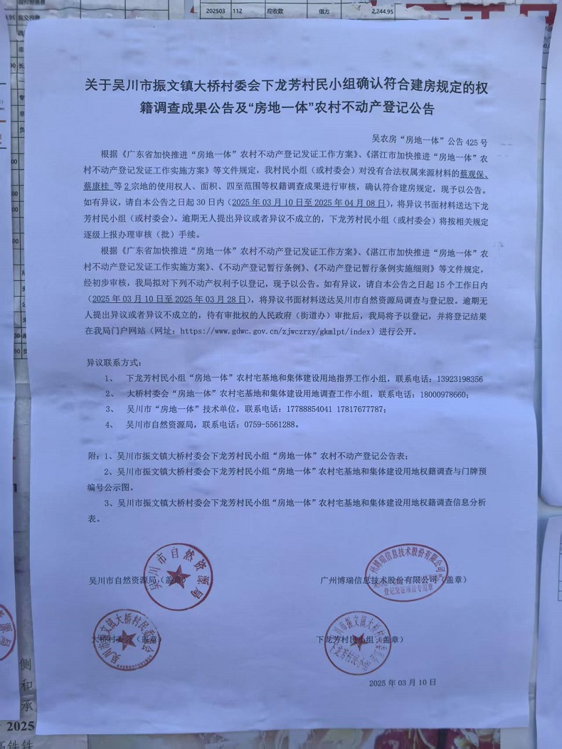 吴川市振文镇大桥村委会下龙芳村民小组确认符合建房规定的权籍调查成果公告及“房地一体”农村不动产登记公告
