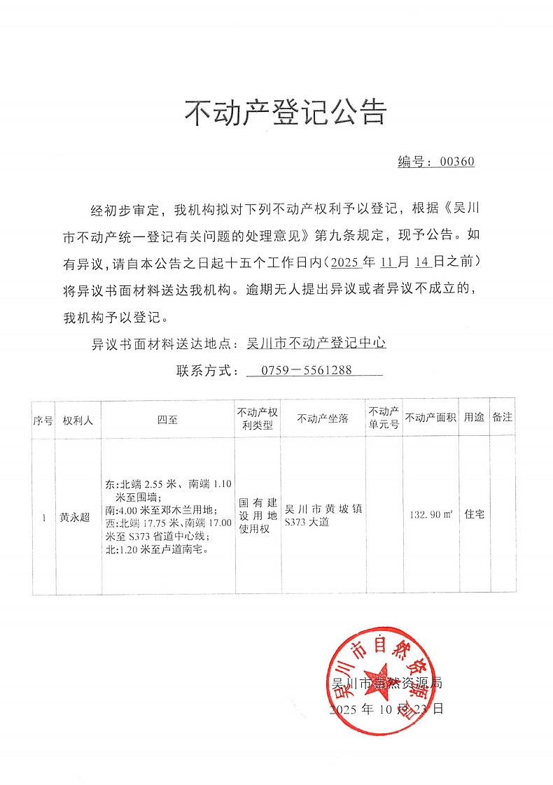 不动产登记公告(黄永超)