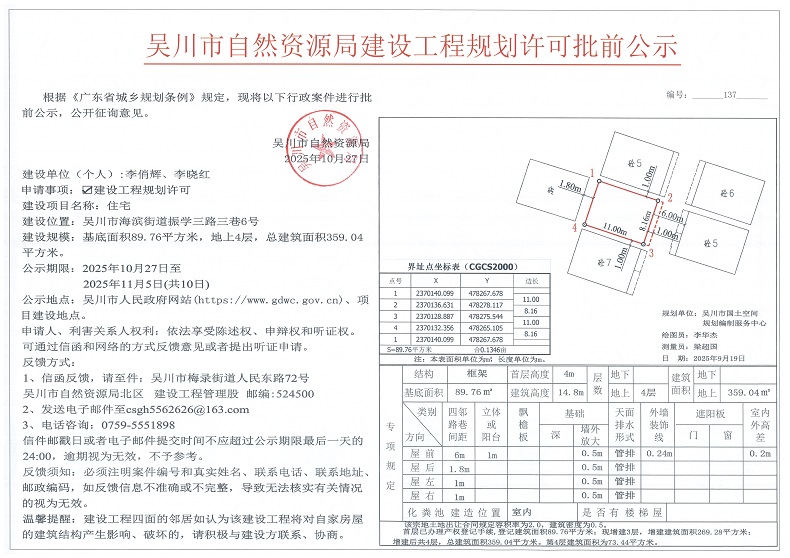 吴川市自然资源局建设工程规划许可批前公示(李俏辉、李晓红)