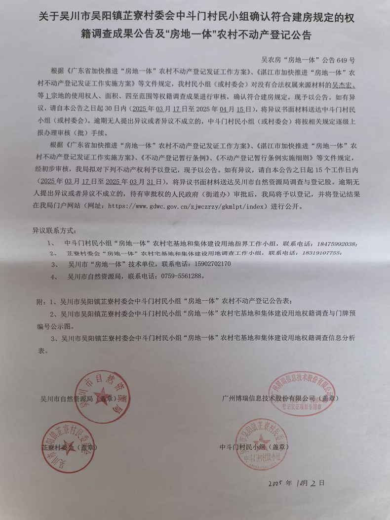 吴川市吴阳镇芷寮村委会中斗门村民小组确认符合建房规定的权籍调查成果公告及“房地一体农村不动产登记公告