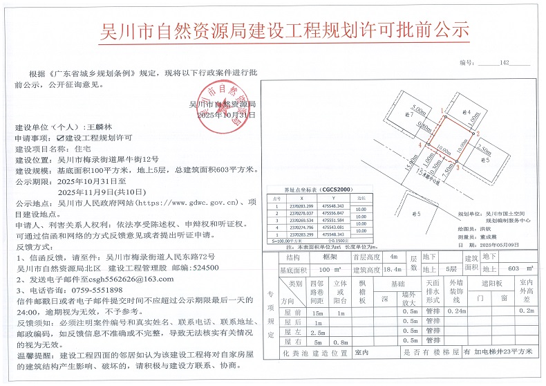 吴川市自然资源局建设工程规划许可批前公示(王麟林)