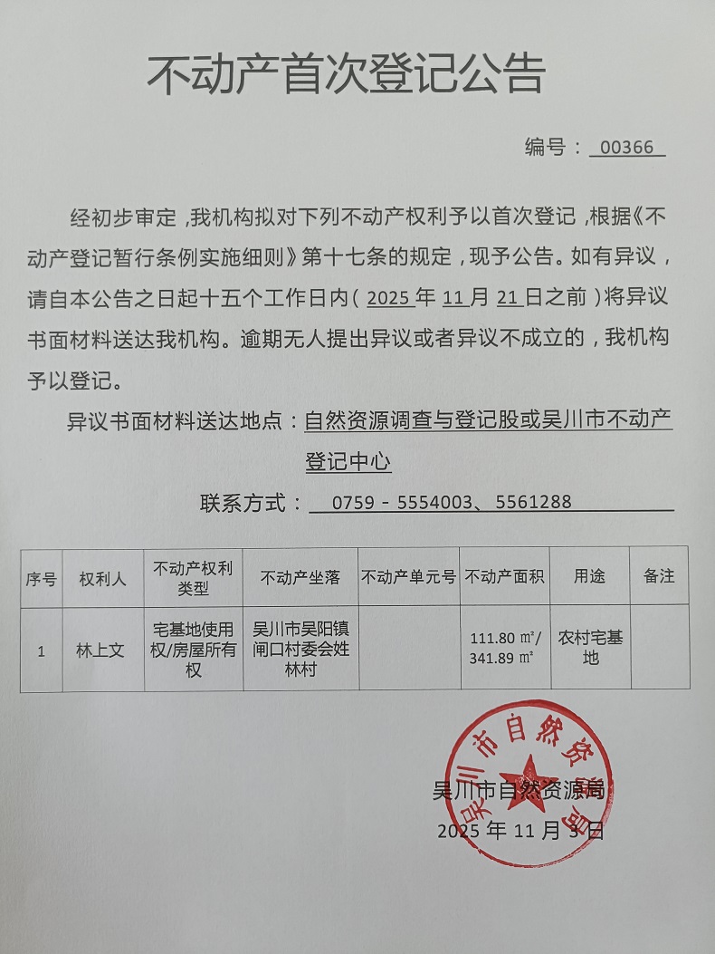 不动产首次登记公告(林上文)宗地面积:111.80平方米、建筑面积:341.89平方米
