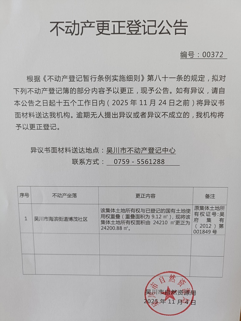 不动产更正登记公告(广东省吴川市海滨街道博茂社区大庙、梅逢社区梅逢、李屋经济合作社)宗地面积:24200.88平方米